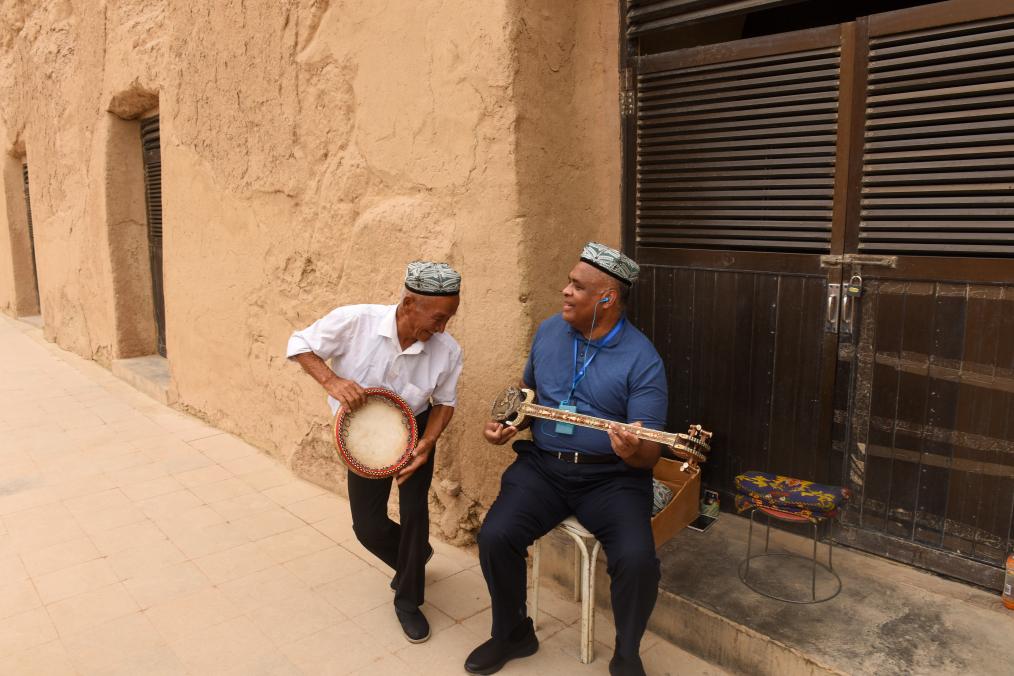 在柏孜克裏克千佛洞,參訪團成員與當地居民共奏一曲(8月15日攝)。新華社記者 高晗 攝