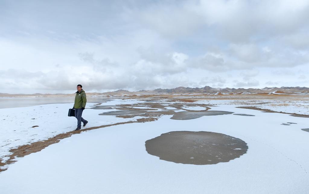 記者和巡護員一起,自西向東巡護保護區。一路顛簸行進,沿途不時可見到三五成群的藏羚羊,點綴在草原上。當發現車輛經過時,它們會停下步伐,齊刷刷地抬頭望來,耳朵直立,機敏地判斷是否有危險。向遠望去,沙漠與沙湖相映,高原野兔四處觀望,黑頸鶴翩翩起舞,讓這個“無人區”生機勃勃。