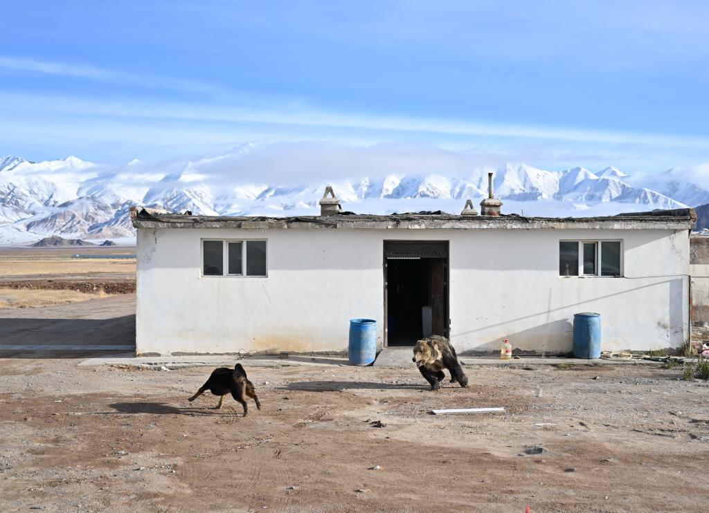 2023年10月17日,一隻藏馬熊(右)闖入新疆阿爾金山國家級自然保護區依協克帕提管護站。新華社記者 李響 攝