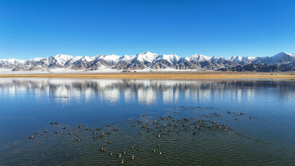 2023年10月18日,在新疆阿爾金山國家級自然保護區,針尾鴨等水鳥在依協克帕提湖棲息(無人機照片)。新華社記者 李響 攝