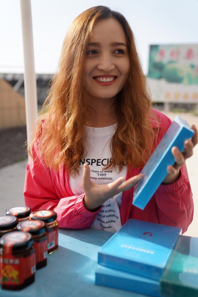 9月24日,在阿圖什市上阿圖什鎮塔庫提村設施農業基地,一位維吾爾族工作人員在推介無花果補水面膜。新華社記者 趙宇思 攝