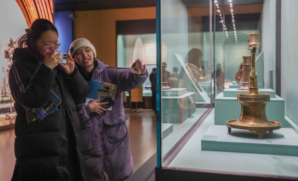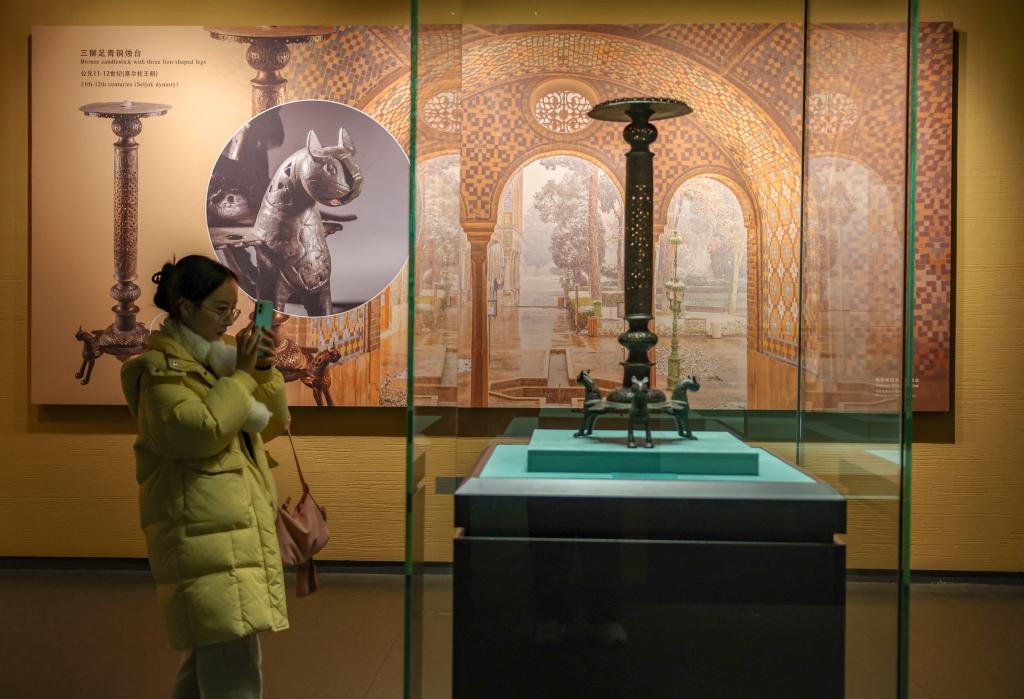12月6日,參觀者在“古波斯的榮耀——伊朗文物精華展”拍攝黃銅燭&。新華社記者 陳朔 攝