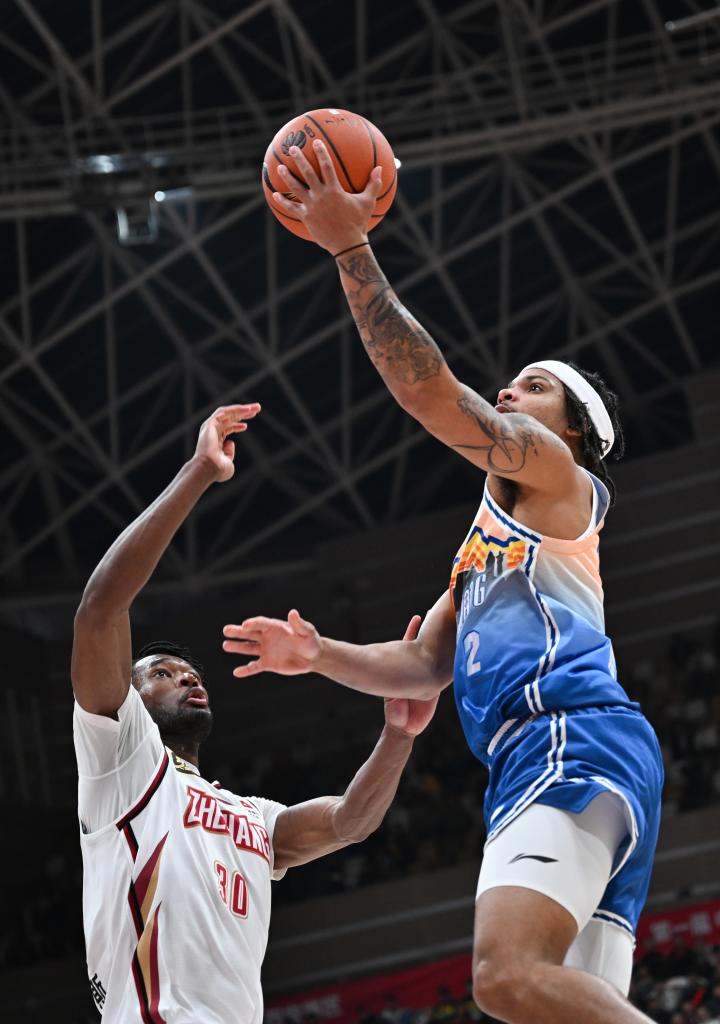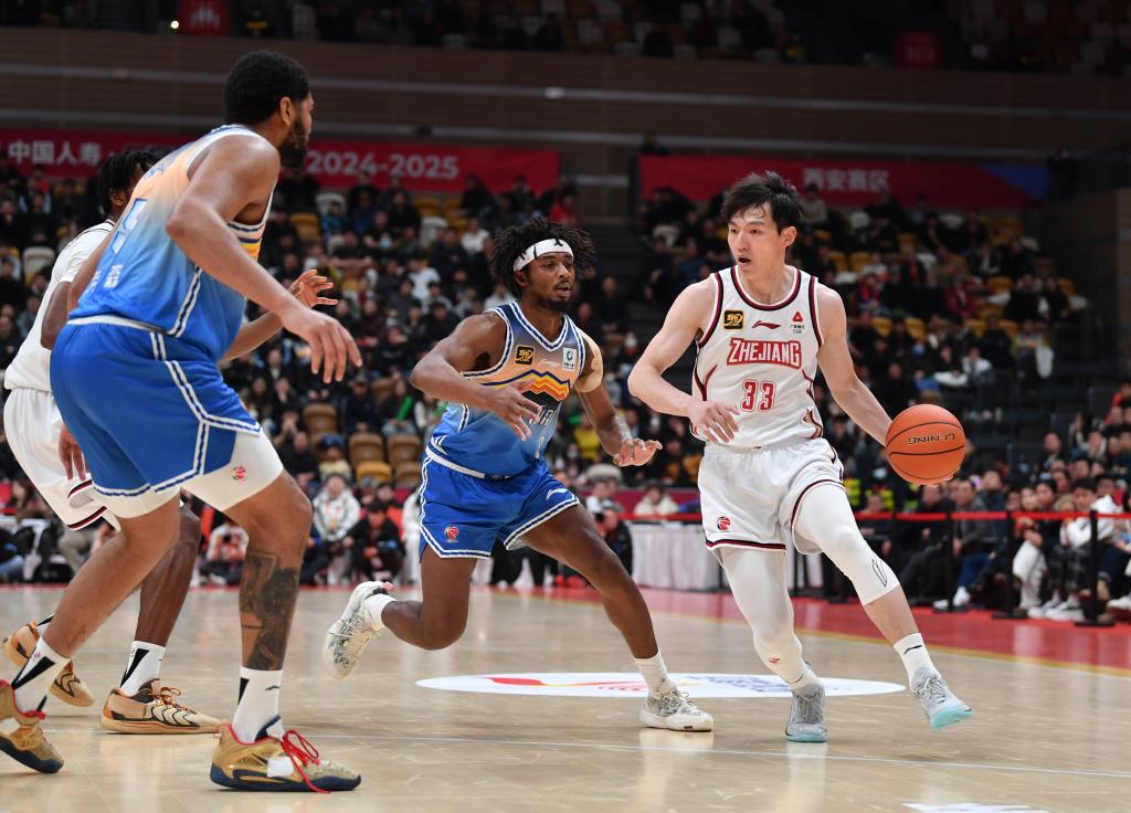 2月9日,浙江稠州金租隊球員王奕博(中)在比賽中進攻。新華社記者 張博文 攝