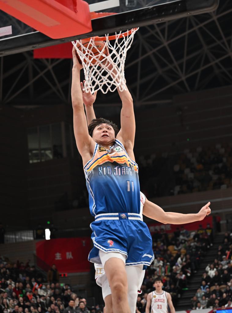 2月9日,新疆伊力特隊球員齊麟在比賽中扣籃。新華社記者 張博文 攝