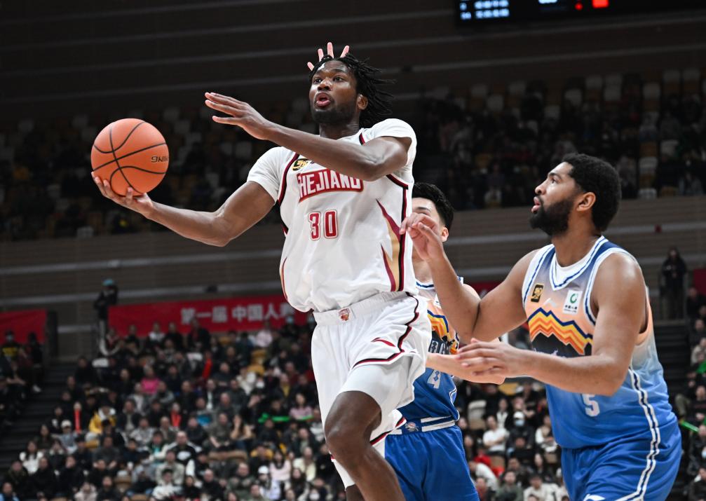 2月9日,浙江稠州金租隊球員約克(右二)在比賽中上籃。新華社記者 張博文 攝