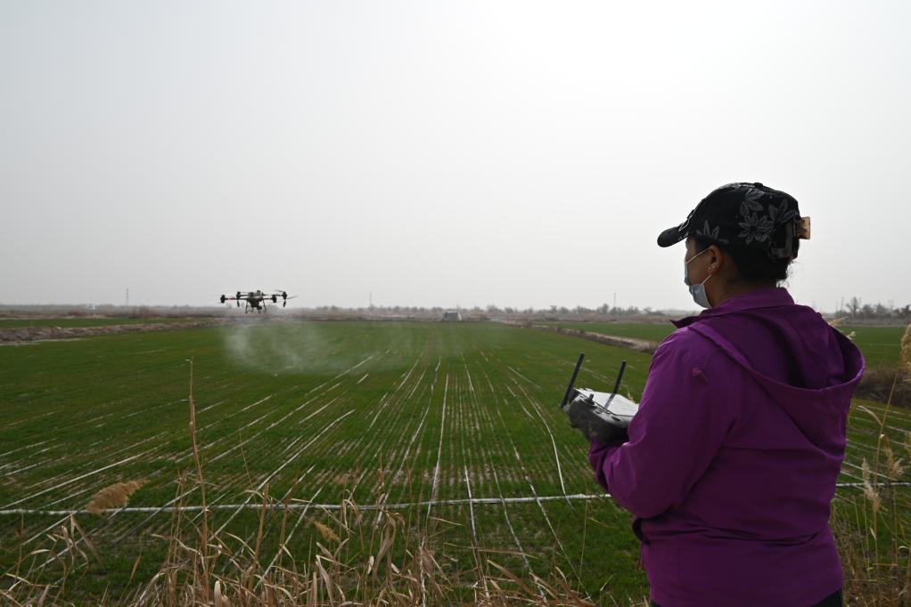 麥田上空,一架農用植保無人機劃出優美的弧線,精準噴灑的霧滴在陽光下折射出彩虹——操控這&智能設備的正是來自新疆喀什地區英吉沙縣色提力鄉的女飛手努日曼古麗·喀斯木。