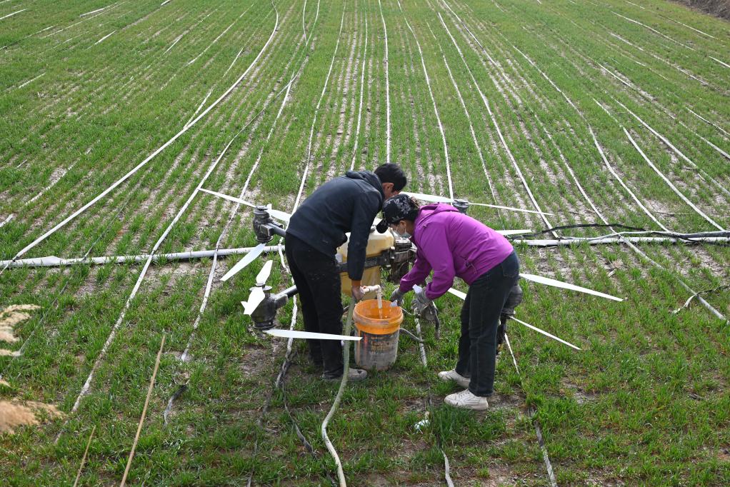 檢查電池、配比藥劑、設定航線,隨着螺旋槳的嗡鳴聲響起,載重50公斤的無人機從色提力鄉托萬霍依拉村的田埂上騰空而起,在距麥苗2.5米的低空展開“芭蕾式”作業。整個操作過程中,努日曼古麗·喀斯木從容自若、沉穩幹練,整套動作行雲流水。