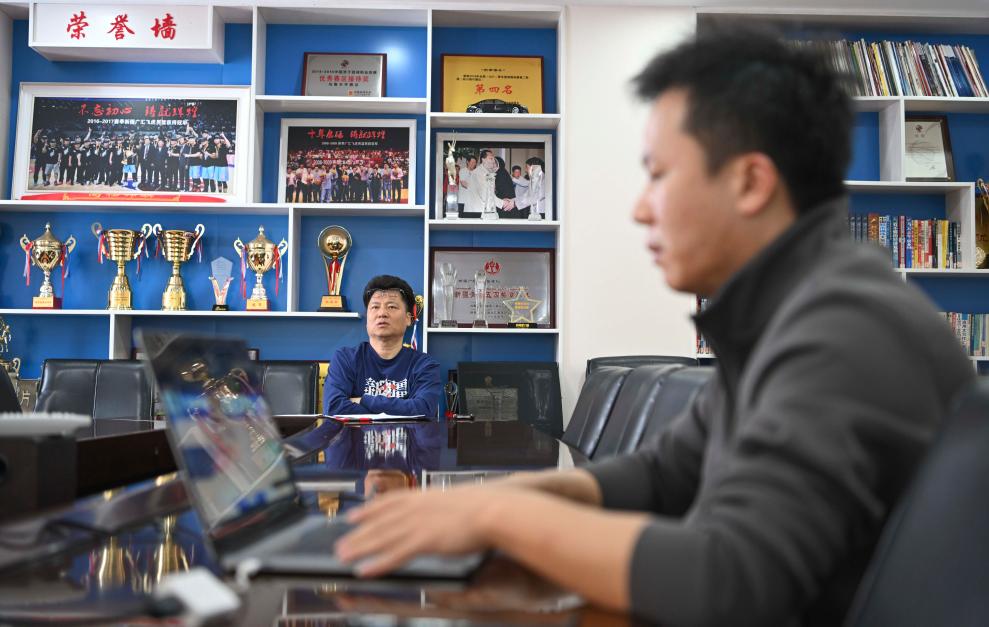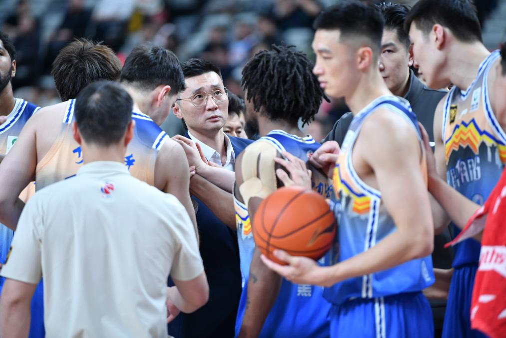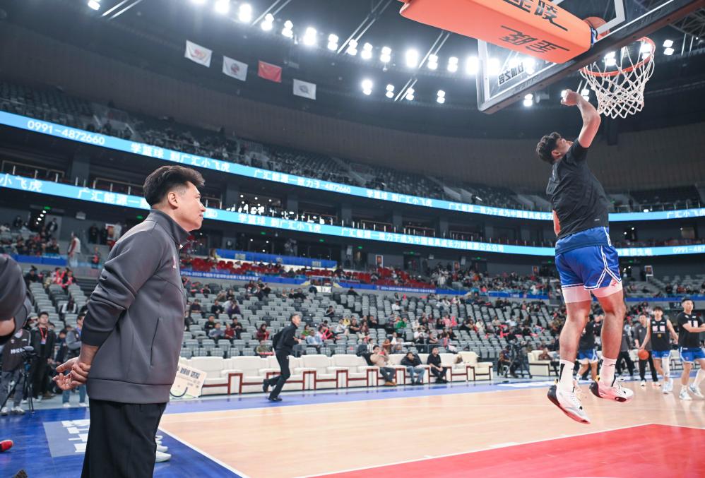 一場比賽前,新疆伊力特隊主教練劉煒(中)將姜正秀等教練組成員、球員聚集在一起加油助威(2025年3月12日攝)。“這就是我們新疆的體育激情!”