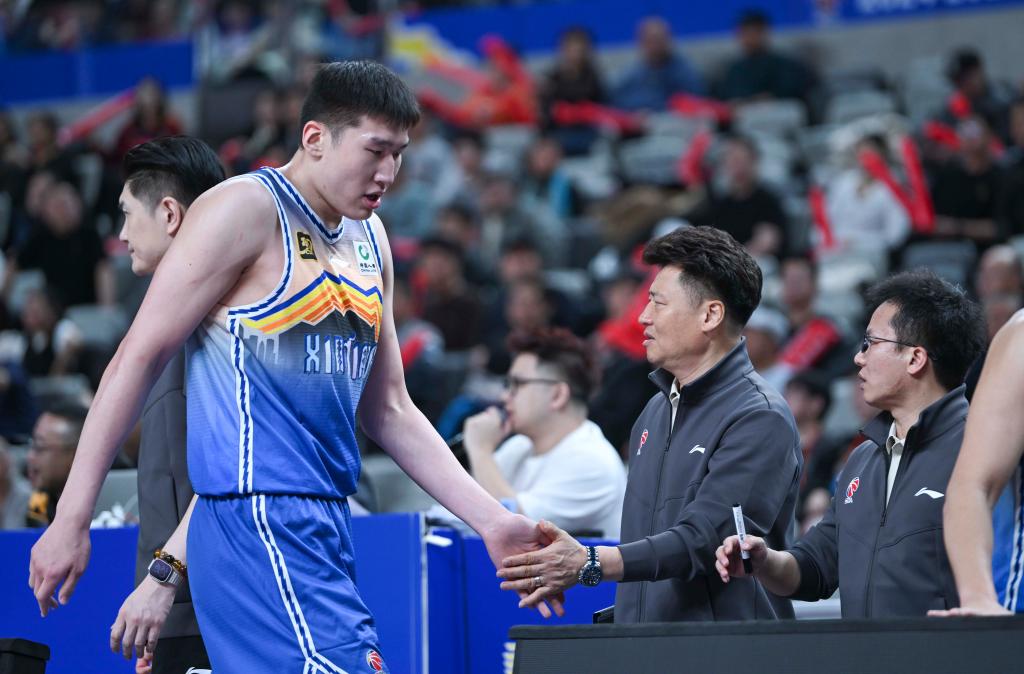 新疆伊力特隊球員李炎哲下場休息,姜正秀(右二)與其擊掌(2025年3月12日攝)。此後雖短暫離開