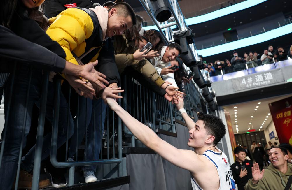 新疆伊力特隊球員阿不都沙拉木賽後離場時與球迷互動(2023年12月11日攝)。