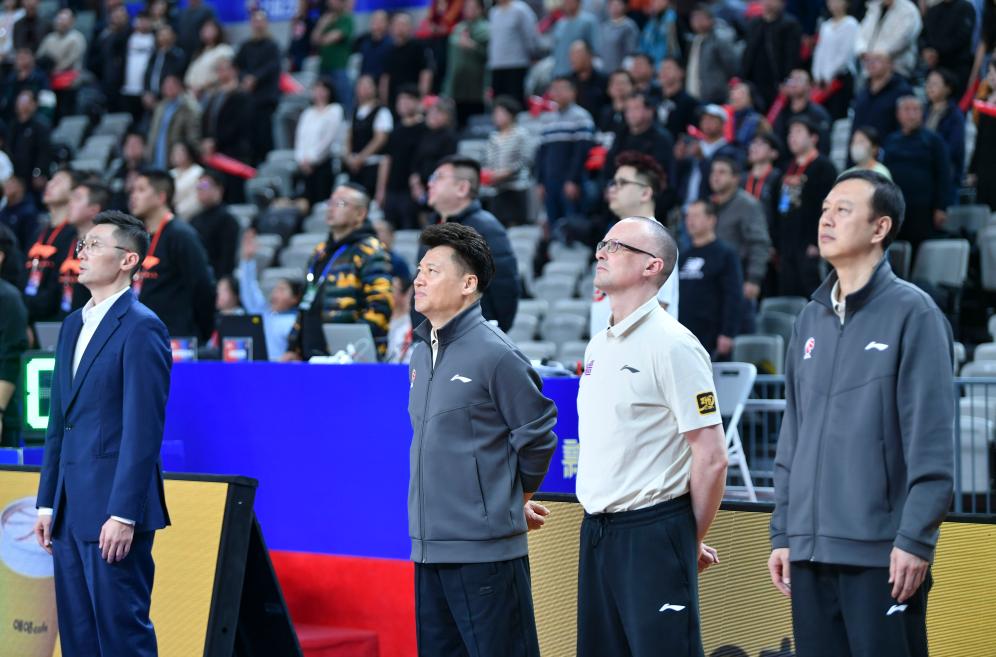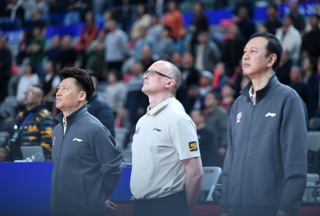在一場CBA比賽前,姜正秀(左)和教練組成員在場邊(2025年3月12日攝)。