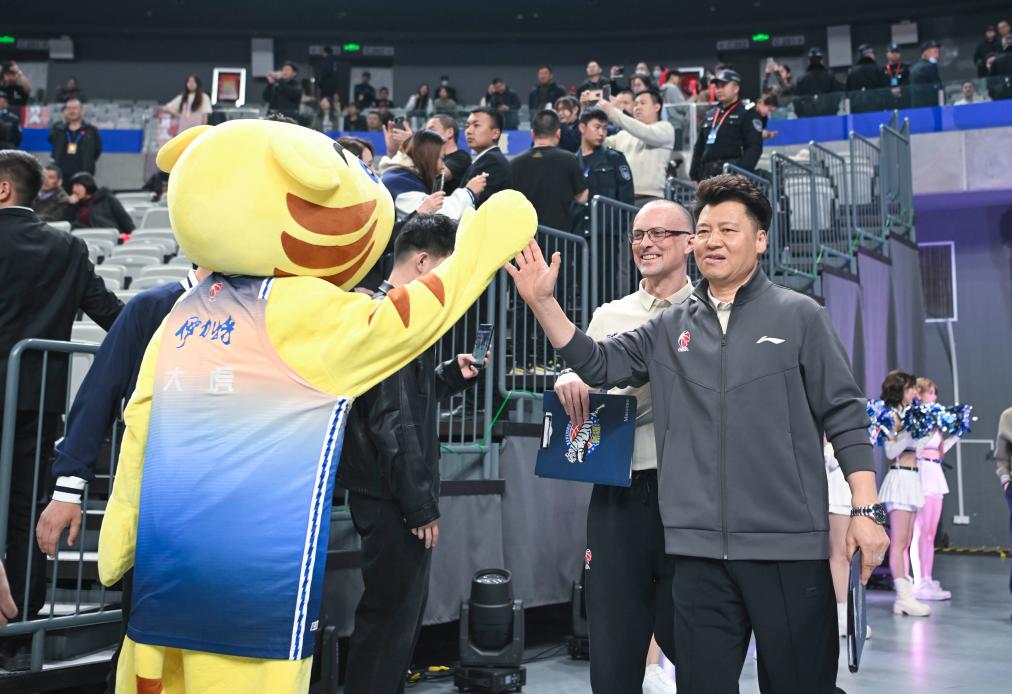 姜正秀在出場時與新疆伊力特隊吉祥物擊掌互動(2025年3月12日攝)。