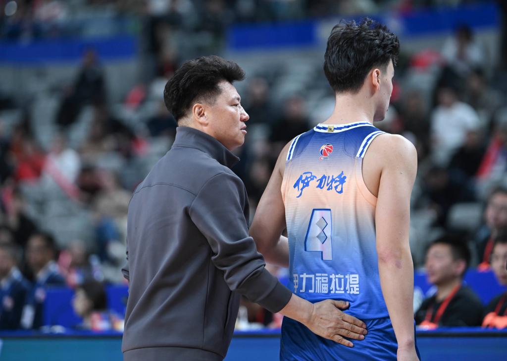 在比賽暫停期間,姜正秀(左)與新疆伊力特隊球員伊力福拉提交流(2025年3月12日攝)。