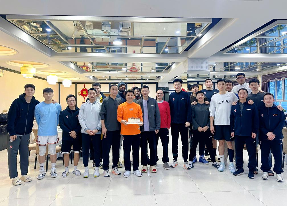 新疆伊力特隊為姜正秀(前左六)過生日(2025年1月9日攝)。新華社發(新疆廣匯男籃俱樂部供圖)