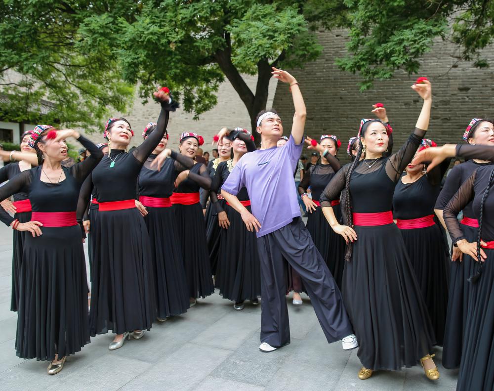 5月15日,熱合木土拉·阿馬努拉在西安長樂門(東門外)教授新疆民族舞蹈。