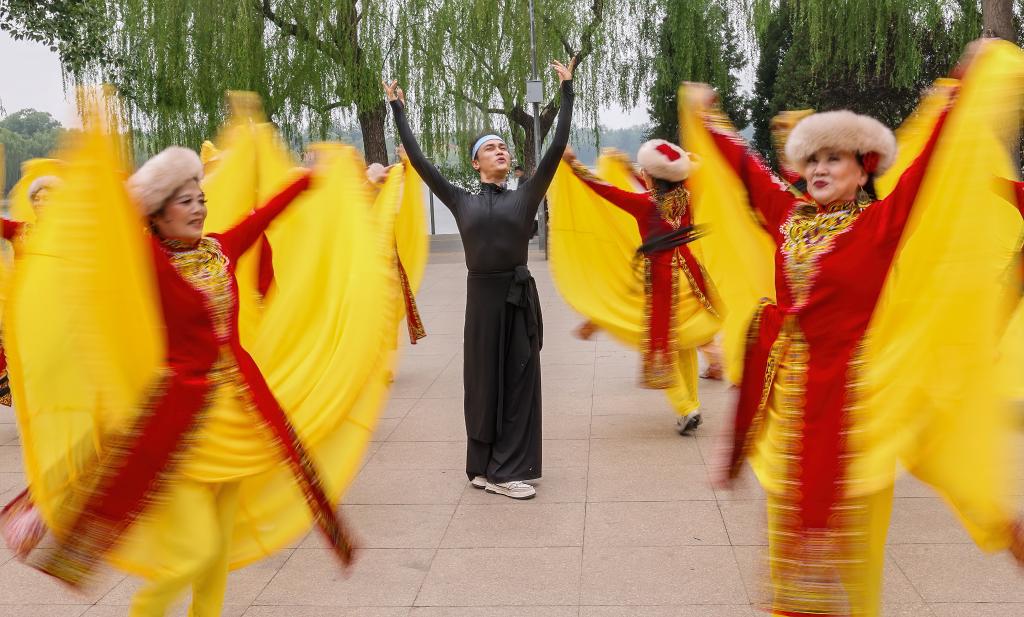 5月24日,熱合木土拉·阿馬努拉在北京龍潭公園教授新疆民族舞蹈。 原新疆藝術劇院歌舞團青年舞蹈編導熱合木土拉·阿馬努拉,畢業於北京舞蹈學院編導係,原創作品多次獲得國內外舞蹈獎項。2020年,他開始從專業舞&走進公園和廣場的教學課堂,向業餘愛好者教授新疆民族舞蹈。他先後在北京、上海、成都、武漢、西安和三亞等地授課,已累計培訓6000余名業餘舞蹈愛好者,年齡最大的87歲,最小的只有7歲。