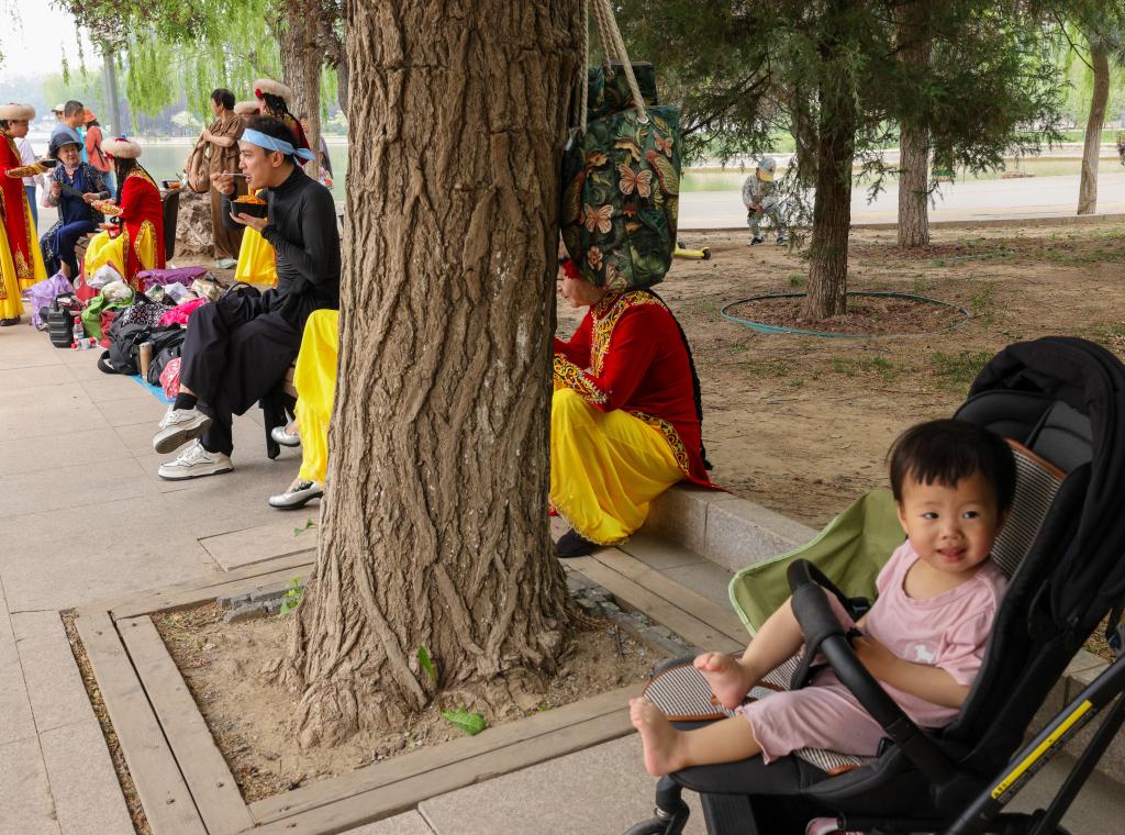 5月24日,在北京龍潭公園,一位游客模仿着新疆民族舞蹈的動作跳起舞來。 記者:殷剛、才揚