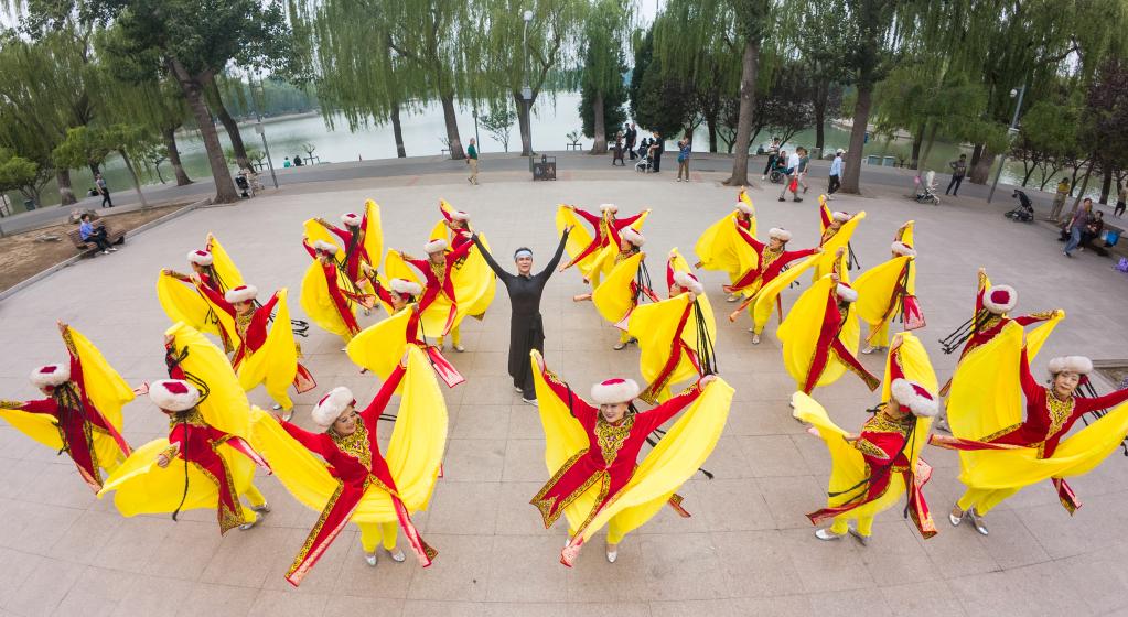 5月24日,在北京龍潭公園,幾位老年舞蹈愛好者在練習新疆民族舞蹈。這支由20多人組成的舞蹈隊有10位隊員年齡超過70歲。 “相對動作的準確性,我更注重講解舞蹈的情感表達,讓業餘愛好者了解每個動作表達的含義。新疆的民族音樂、舞蹈都很歡快,很容易融入,希望每個學習者在身體和精神上都得到享受,通過舞蹈的學習,讓更多人喜歡上新疆的民族文化。”這是熱合木土拉·阿馬努拉的教學理念。