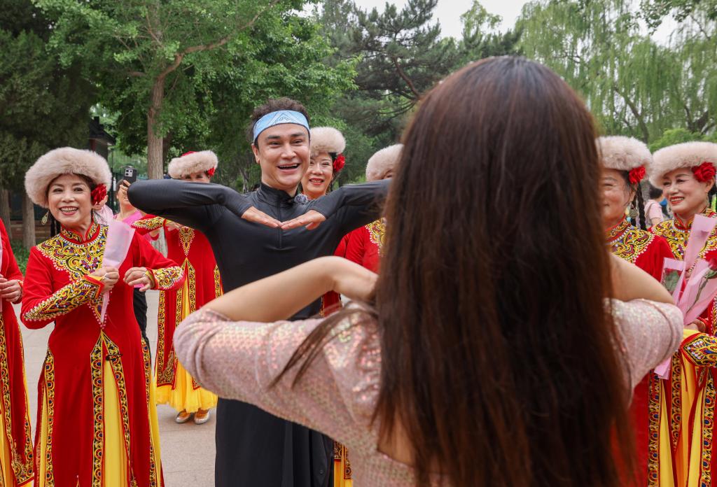 5月24日,在北京龍潭公園,熱合木土拉·阿馬努拉在教一位游客新疆民族舞蹈基本動作。