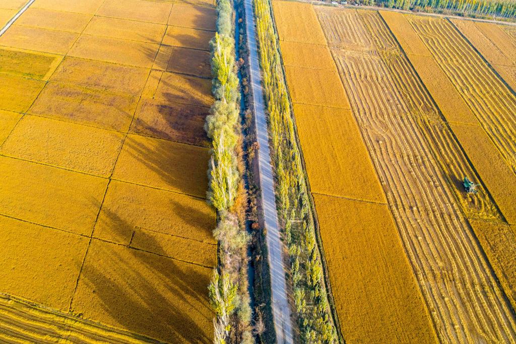 2020年10月16日,在新疆阿克蘇地區溫宿縣托乎拉鄉托萬克蘇布拉克村2小隊,收割機在田間收割水稻(無人機照片)。 阿克蘇地區溫宿縣地處天山南麓,是新疆水稻主産區之一。金秋時節,溫宿縣11.8萬多畝水稻陸續進入成熟期。新華社記者 胡虎虎 攝