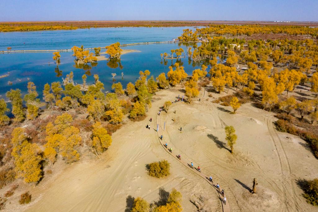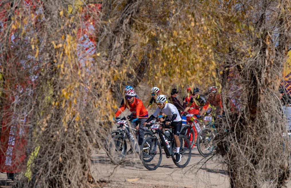2020年10月24日,越野愛好者騎行在新疆阿克蘇地區沙雅縣的胡楊林間。當日,新疆“胡楊勇士杯——沙雁洲越野挑戰賽”在阿克蘇地區沙雅縣鳴槍開賽,本次賽事吸引了逾百名越野愛好者參加。胡楊層林盡染,分外壯美,越野愛好者穿梭其間,享受挑戰自我極限的運動樂趣。新華社記者 胡虎虎 攝