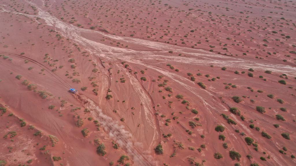 5月23日,河北遷安九江汽摩運動俱樂部車手趙玉喬、領航員桂海波駕駛賽車在比賽中(無人機照片)。當日,2025中國環塔國際拉力賽第三賽段比賽在新疆阿克蘇地區柯坪縣進行。該賽段長330多公里,以狹窄涉水峽谷、戈壁等地形地貌為主。 新華社記者 胡虎虎 攝