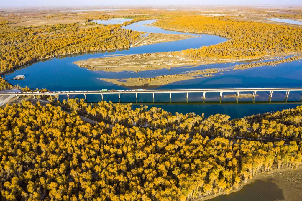 這是2020年10月22日拍攝的新疆塔裏木河畔的阿克蘇地區沙雅縣月亮灣景區內的胡楊林(無人機照片)。新疆南部沿塔裏木河流域分佈着約1500萬畝胡楊林,是世界面積最大的胡楊林區,其中阿克蘇地區沙雅縣境內約有470萬畝。新華社記者 胡虎虎 攝