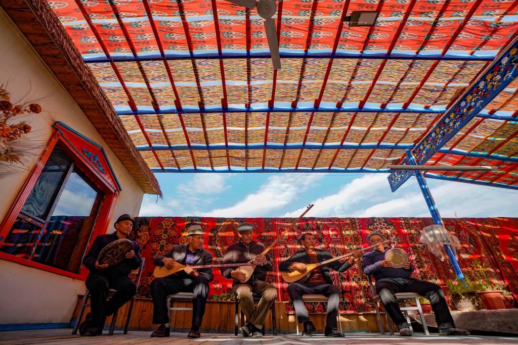在新疆阿克蘇地區新和縣加依村,非遺傳承人努爾東·司馬義(左二)和村民在院子裏演奏(2024年10月30日攝)。加依村樂器製作歷史悠久,被譽為“新疆民間手工樂器製作第一村”。新華社記者 陳朔 攝