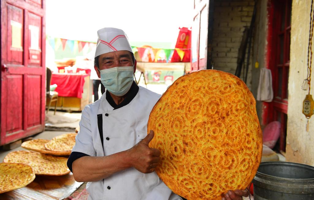 2021年3月24日,熱西提·依米提展示親手烤制的馕。在新疆阿克蘇地區庫車市,61歲的打馕人熱西提·依米提堅持採用傳統工藝制馕,製作的大馕直徑逾半米,形如車輪,酥脆可口,遠近聞名。新華社記者 侯昭康 攝
