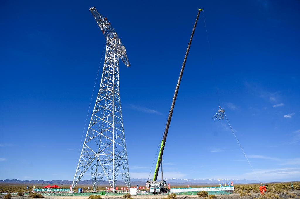 在新疆哈密市伊吾縣,哈密—重慶±800千伏特高壓直流輸電工程施工現場,工程建設人員進行鐵塔組立作業(2024年7月12日攝)。