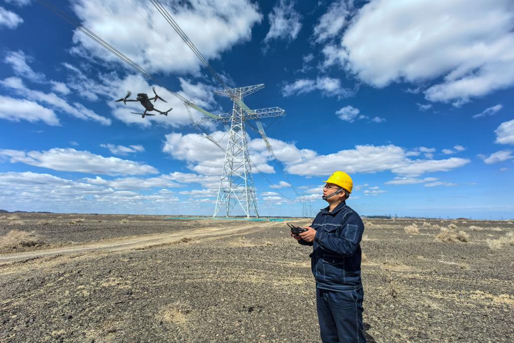 在新疆哈密市,電力員工操縱無人機對哈密—重慶±800千伏特高壓直流輸電工程進行驗收(4月3日攝)。