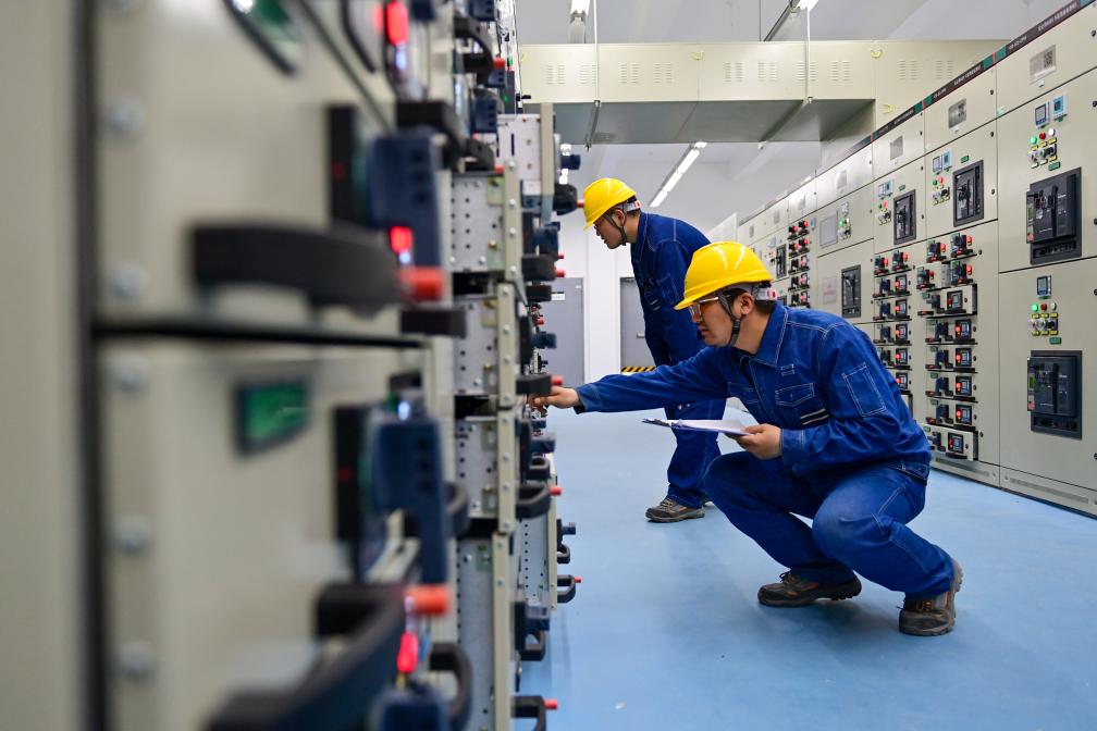 6月10日,在哈密—重慶±800千伏特高壓直流輸電工程新疆送端站——巴裏坤換流站,運檢人員在配電室進行巡檢工作。