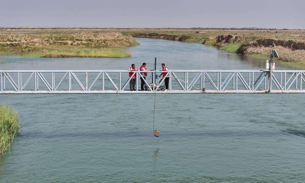 8月6日,新疆塔裏木河流域幹流管理局下游管理處大西海子水庫管理站工作人員對生態水下泄流量進行監測。