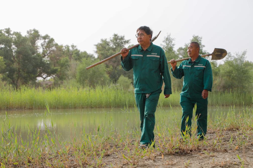 8月6日,新疆生産建設兵團第二師鐵門關市34團蒲昌鎮護林員在河邊開展巡護工作。
