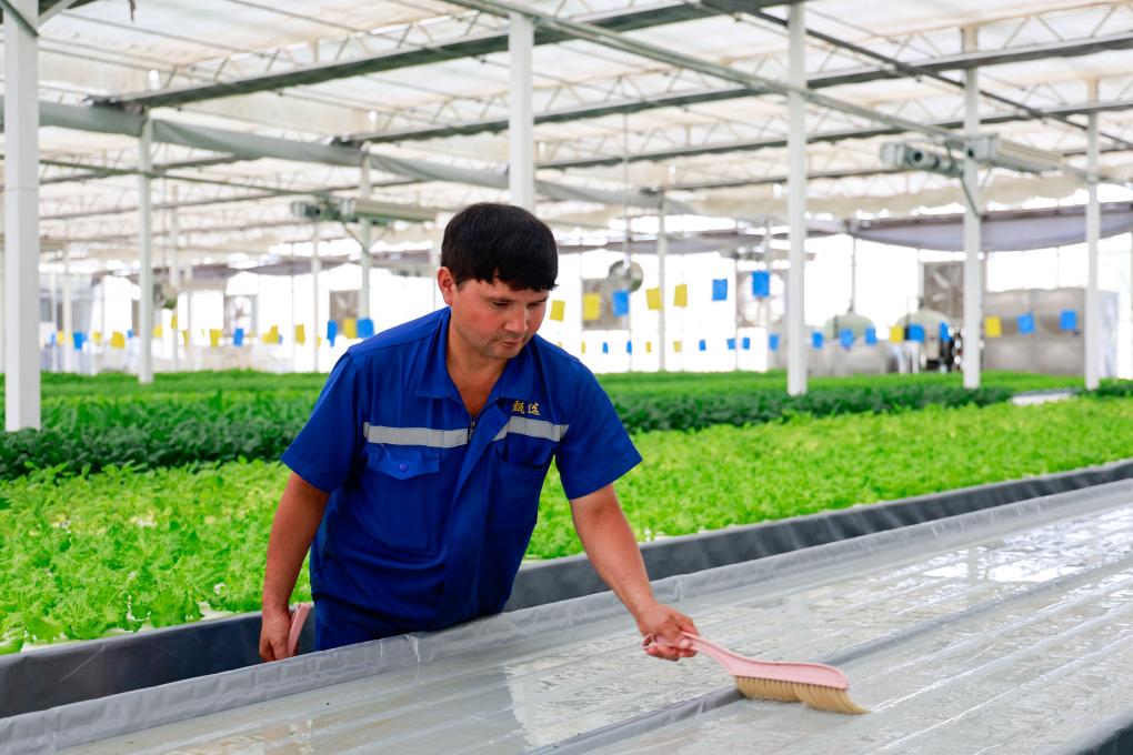 8月13日,在新疆阿克蘇地區庫車市甬庫同心村智慧農業植物工廠,工作人員在清洗定植床。