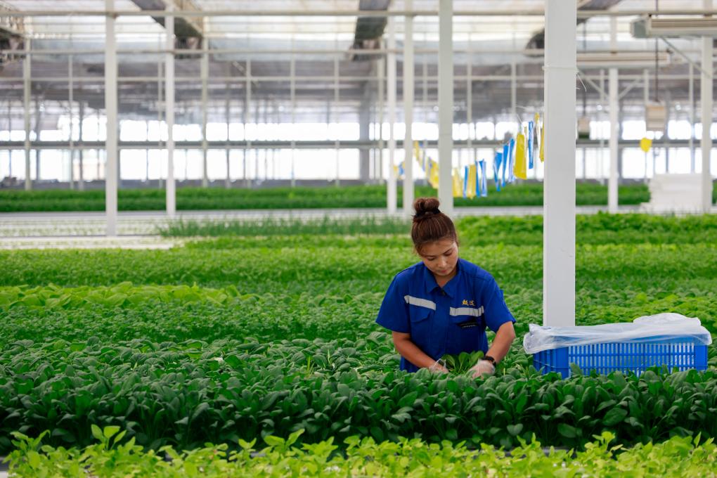 8月13日,在新疆阿克蘇地區庫車市甬庫同心村智慧農業植物工廠,工作人員在收割蔬菜。