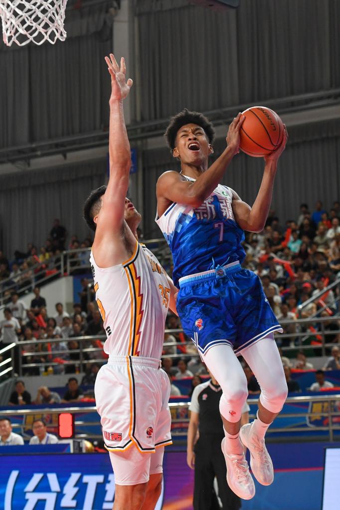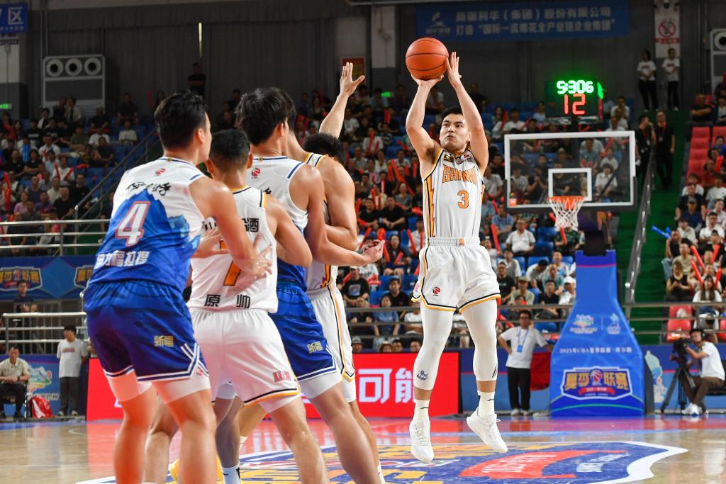8月15日,山西汾酒隊球員賈明儒(右一)在比賽中投籃。新華社記者 高晗 攝