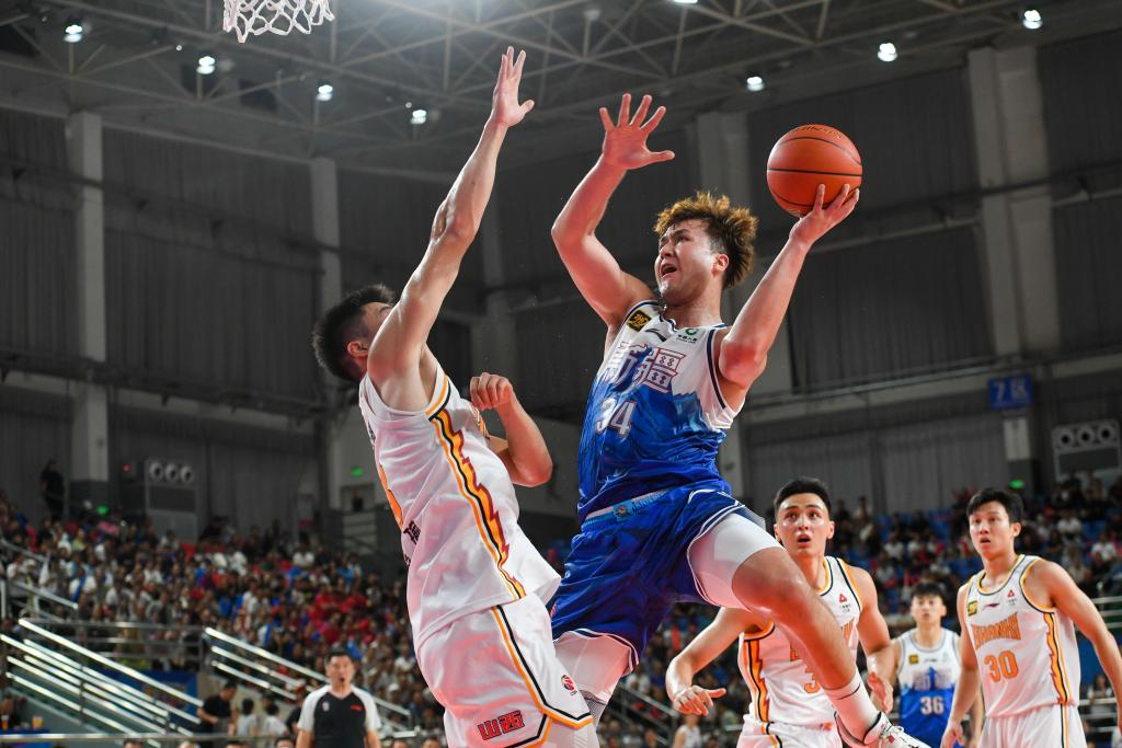 8月15日,新疆伊力特隊球員曲笑宇(右)在比賽中持球進攻。新華社記者 高晗 攝
