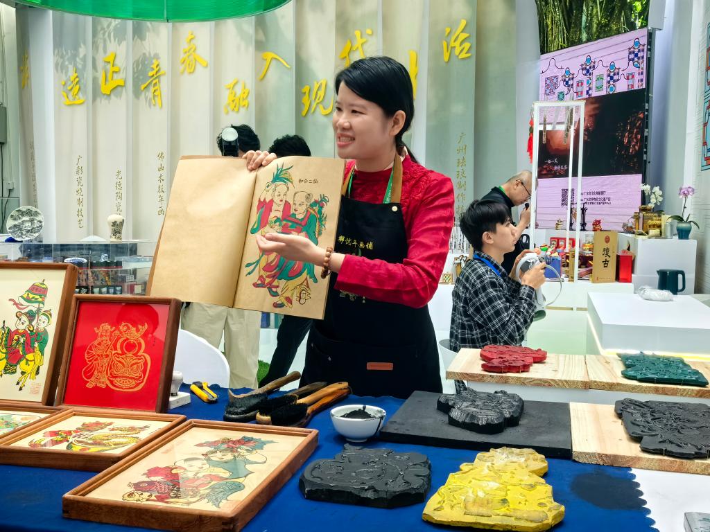 “要讓非遺‘潮’起來。”國家級非物質文化遺産代表性項目佛山木版年畫市級代表性傳承人劉鐘萍的作品也引人注目。這位“80後”致力於將佛山木版年畫以青春的語言重新演繹,在“解憂年畫鋪”展位推出“逢考必過”“脫單神器”等符合年輕人需求的木版年畫作品。