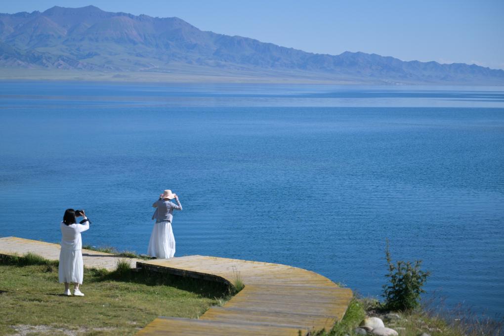游客在賽裏木湖畔游玩、拍照(7月9日攝)。新華社記者 辛悅衛 攝