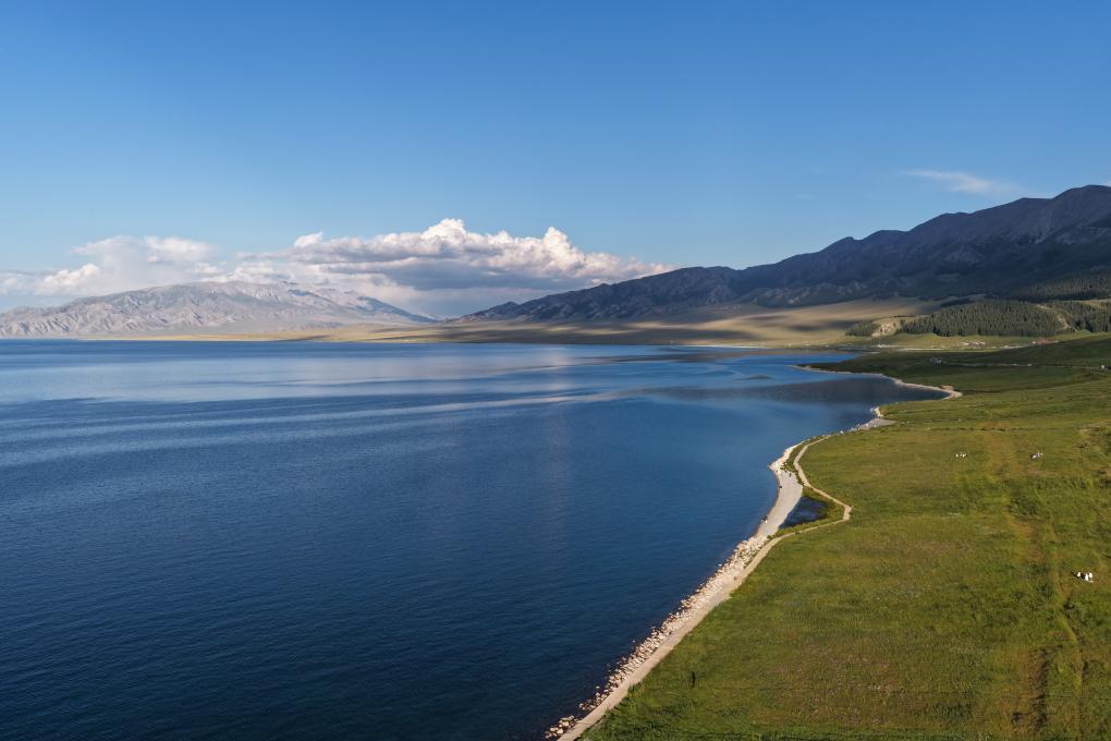 9月10日拍攝的賽裏木湖和湖畔公路。新華社記者 張浩波 攝