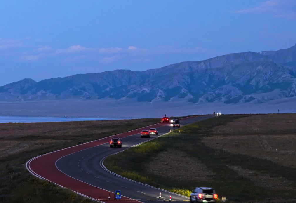 游客駕車行駛在賽裏木湖景區(無人機照片,7月8日攝)。新華社記者 辛悅衛 攝
