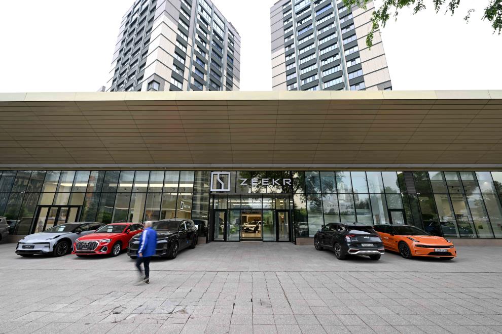 5月26日,在哈薩克斯坦阿拉木圖市區,一名男子從一家中國品牌新能源汽車門店前走過。新華社記者 李任滋 攝