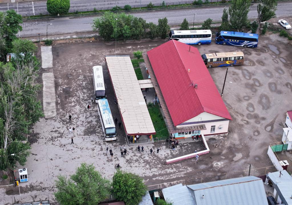 5月24日清晨,“擺渡人”在哈薩克斯坦扎爾肯特鎮汽車站準備登上返回霍爾果斯的大巴。新華社記者 李任滋 攝