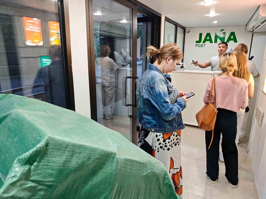 5月25日,在哈薩克斯坦阿拉木圖,人們在一家主要負責中國網購平台物流服務的快遞網點排隊等待自提。