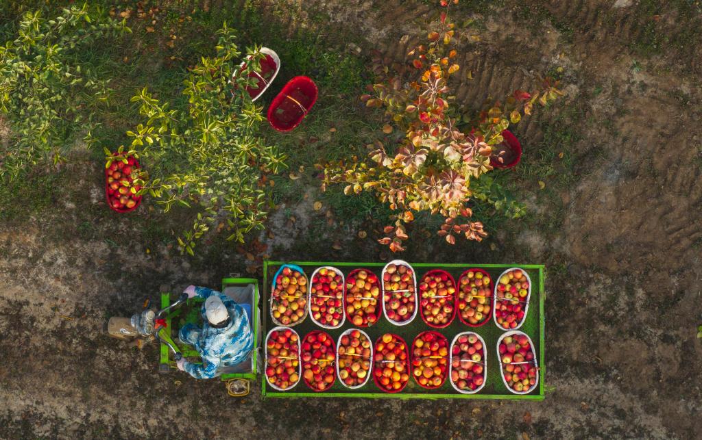 10月23日,在新疆生産建設兵團第一師阿拉爾市六團三連蘋果園,林果業服務隊隊員運輸剛採摘的蘋果(無人機照片)。