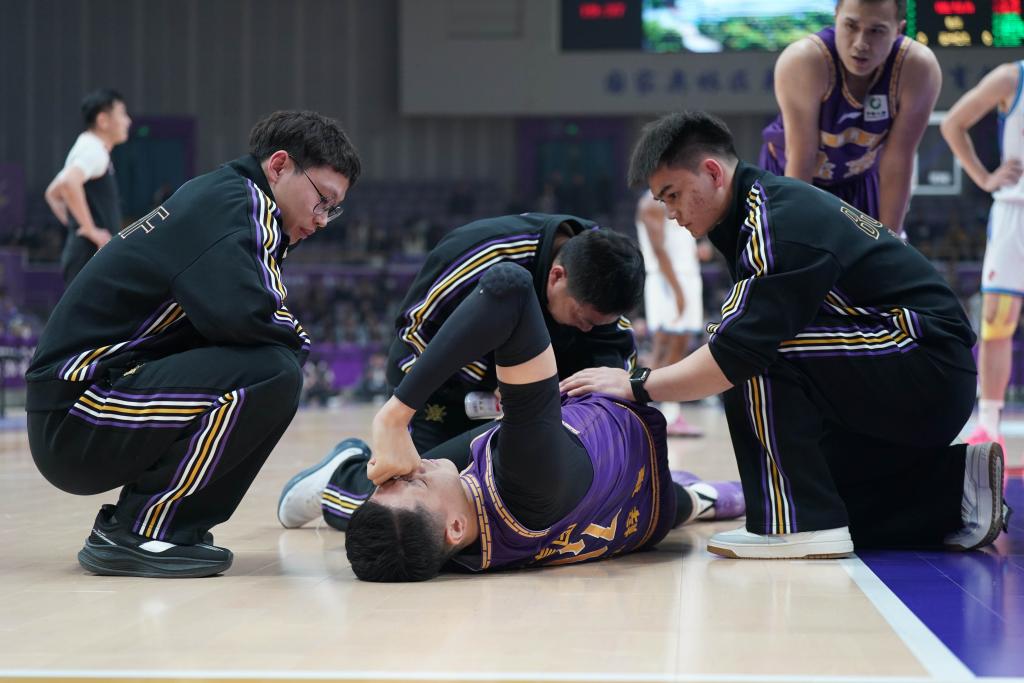 12月18日,北京控股隊球員沈梓捷(中下)在比賽中受傷倒地。新華社記者 謝晗 攝