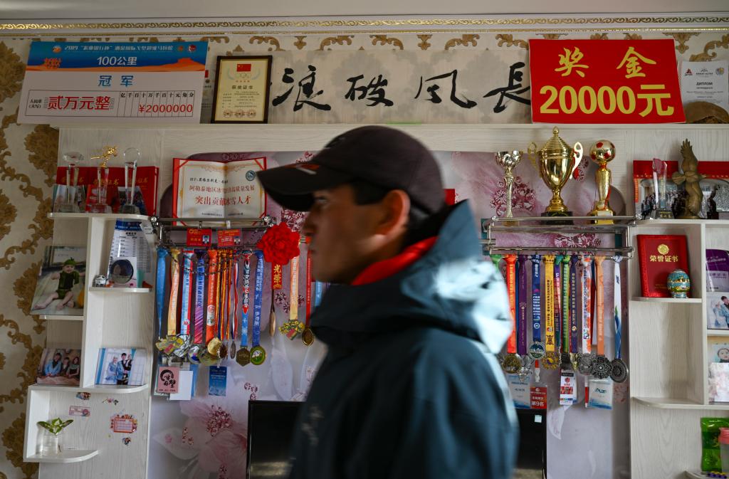 買依爾別克·赤合斯經過家中的“榮譽墻”(2022年12月22日攝)。