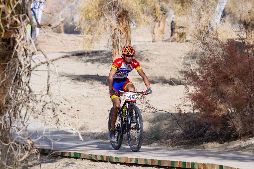 這是買依爾別克·赤合斯在新疆沙雅縣參加一項越野挑戰賽(2020年10月24日攝)。