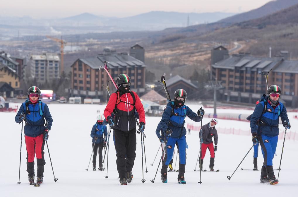 在吉林省吉林市中旅松花湖度假區,買依爾別克·赤合斯(前,左二)帶領四川滑雪登山隊運動員備戰2025年全國滑雪登山錦標賽(2025年12月13日攝)。